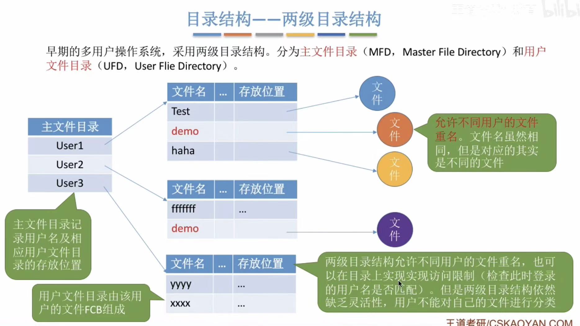 两个用户的FCB可以同时指向同一个文件,这样这两个用户打开自己的这个文件时,访问到的都是被指向的文件。