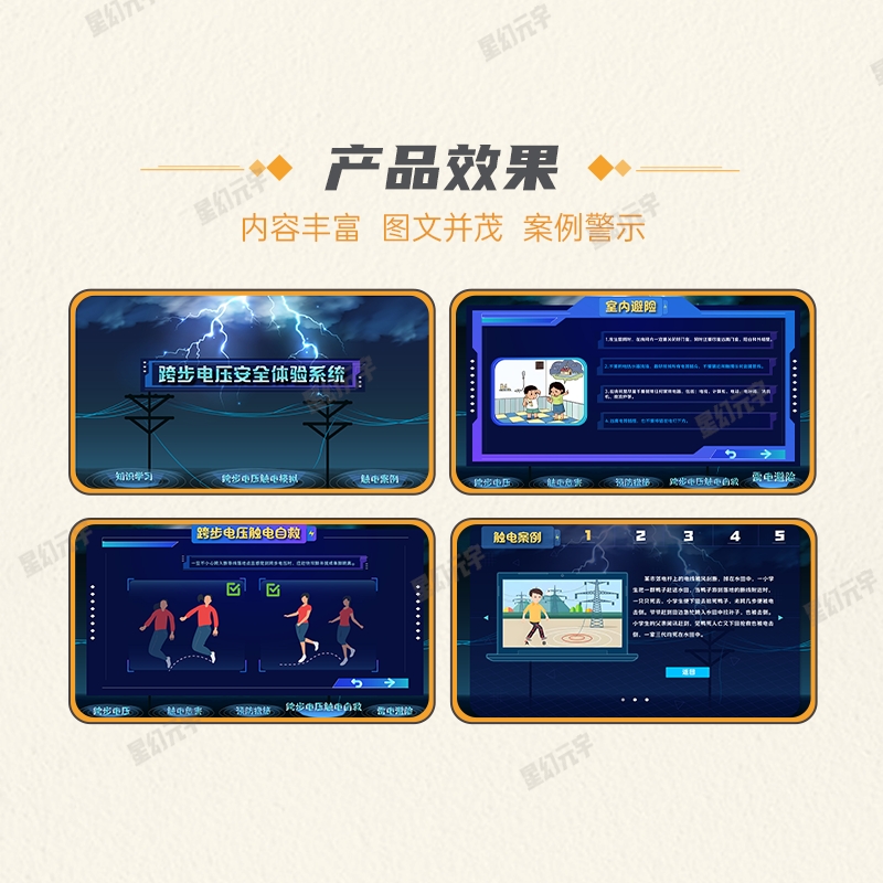 系统内容涵盖理论科普与实操体验两大板块,形成完整的培训闭环。理论科普板块依托触摸一体机展开,全面覆盖跨步电压基础定义、触电危害特征、日常预防措施、跨步电压触电自救方法、雷电避险技巧及典型触电事故案例,从认知到防范、从应急到警示,构建全维度知识体系,帮助体验者建立系统的安全认知。实操体验板块借助触电行走体验平台实现,体验者可直观感受跨步电压触电状态,系统能实时捕捉体验者的行走姿势、触电逃离姿势,同步触发一体机显示对应的指导信息与动画提醒,让体验者在沉浸式演练中纠正错误动作,掌握正确的逃生方法。