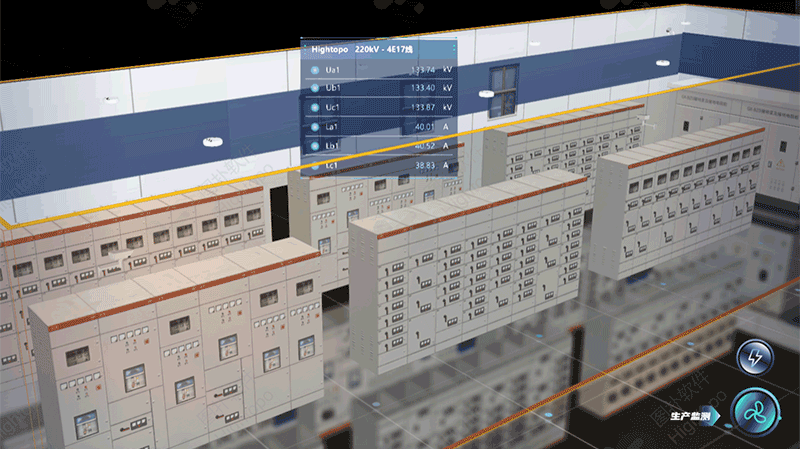 - 设备数据交互:为每个配电柜绑定唯一标识,通过 JavaScript 脚本建立设备模型与监测数据的关联,用户点击配电柜 3D 模型时,触发数据查询与展示事件,调用 API 接口加载并显示主变高压侧测控数据(如电压、电流等参数)。
