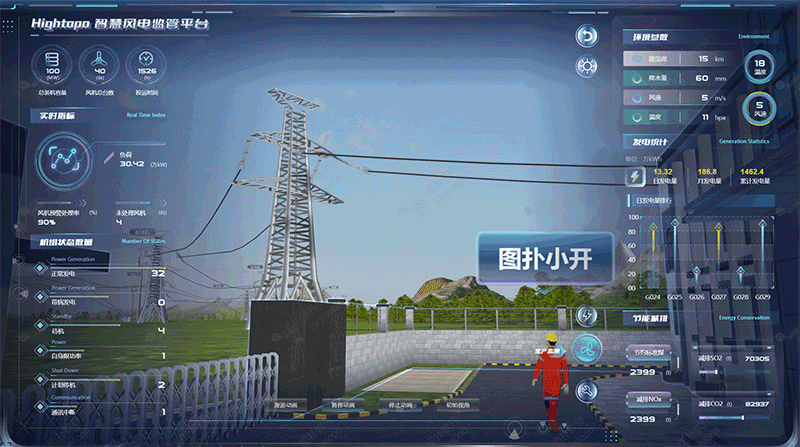 - 数据处理与更新:获取各类数据后,通过 JavaScript 脚本解析数据格式,调用 HT for Web 提供的 API 接口,实现 2D 面板数据动态更新、3D 场景状态实时同步,确保可视化界面与风电场实际运行状态保持一致。