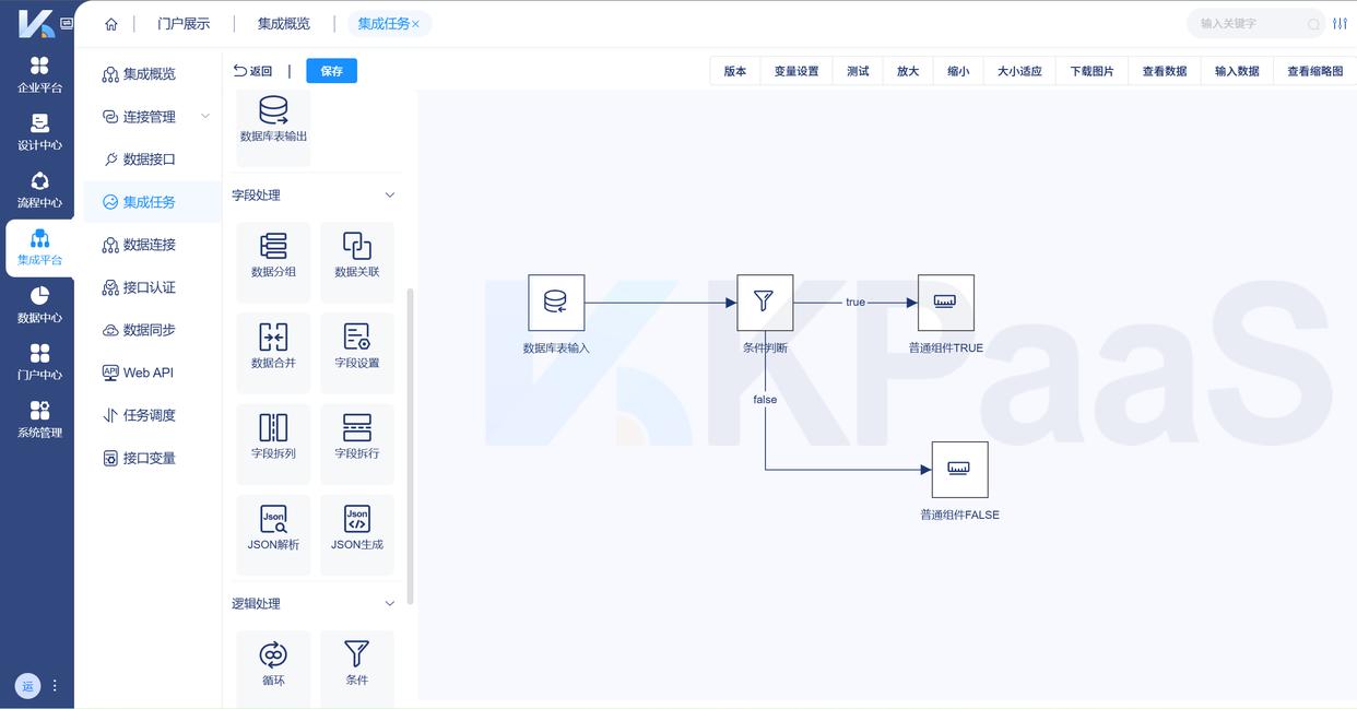 KPaaS平台提供灵活的拖放操作界面,使得企业能够轻松在编辑器中构建集成任务,配置各种节点间的交互,如数据分组、数据合并、数据关联等。