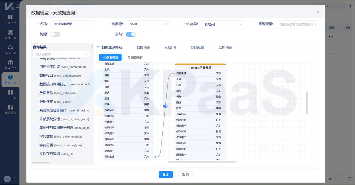 KPaaS平台支持数据库、API、文件等跨源数据集模型配置,并直观展示数据血缘关系。