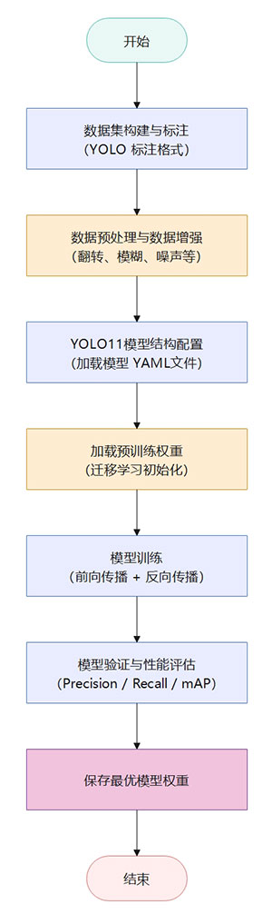模型训练流程如下:首先对服装厂废料(边角料)数据集进行规范标注,并按照 YOLO 标准格式生成对应的标签文件;随后对样本进行尺寸归一化处理,并引入数据增强策略,以提升模型在复杂车间环境、不同光照条件以及废料堆叠遮挡等情况下的鲁棒性。在此基础上构建 YOLO11 目标检测模型,并加载预训练权重进行迁移学习。训练过程中通过前向传播与反向传播不断优化网络参数,同时在验证集上进行性能评估与超参数调优,最终保存指标表现最优的模型权重文件(best.pt),用于服装厂废料分类检测系统的部署与实际应用。