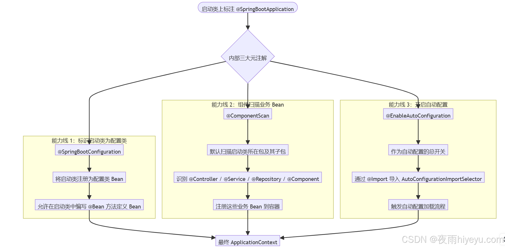 @SpiringBootApplication 把这三条路径的"起点"收拢在同一个注解上,在源码和文档中都形成了非常一致的约定【turn0search10】【turn0search14】。