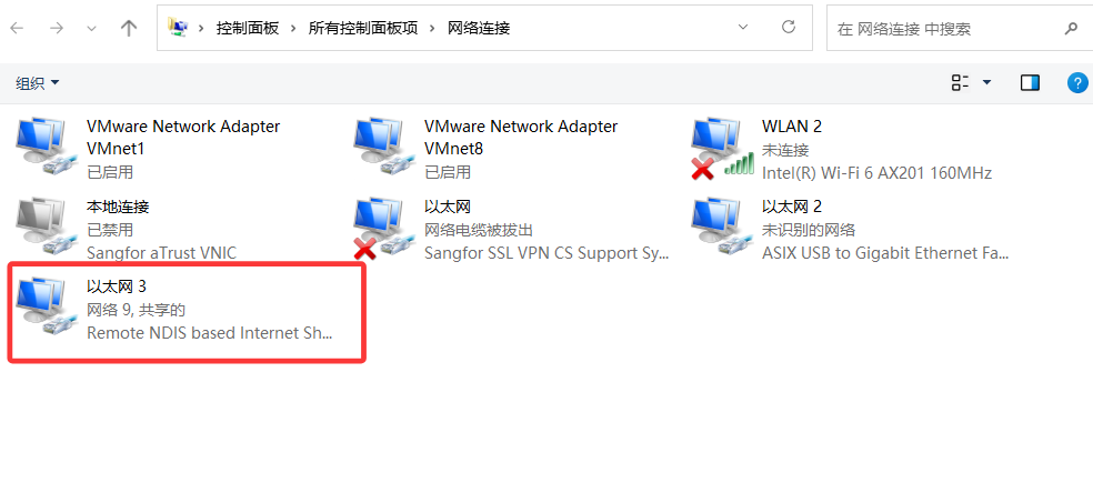 找到手机USB共享的网络连接(通常显示为"Remote NDIS based Internet Sharing Device")
