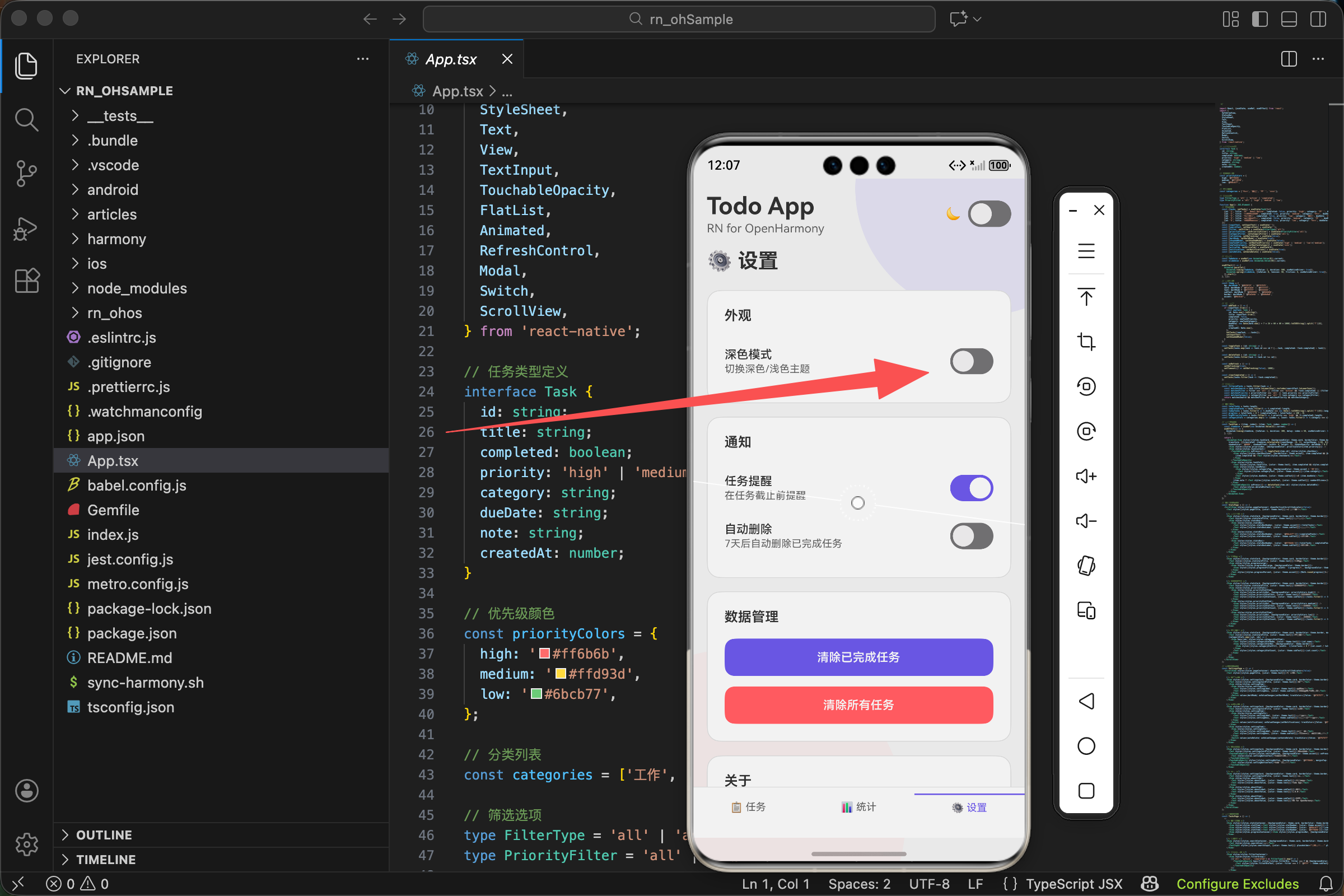 两个开关控制同一个状态 darkMode,所以它们是同步的。在导航栏切换,设置页的开关也会变;在设置页切换,导航栏的开关也会变。