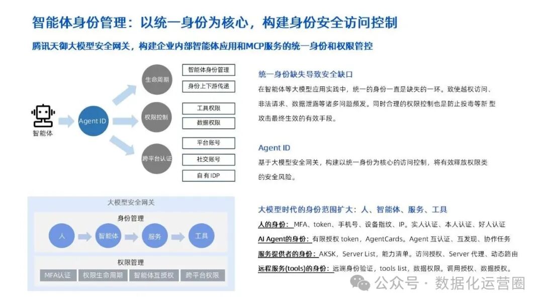 :作为第三道也是最后一道防线,统一管理智能体、服务、工具及人员的身份与权限,实施严格的访问控制,防止越权访问与数据泄露,确保业务环境的安全可控。