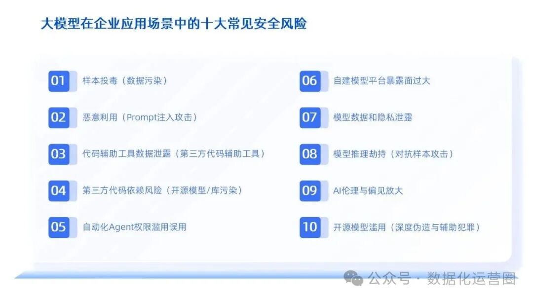 在企业将大模型深度融入业务场景的过程中,往往会遭遇十大核心安全挑战:数据被恶意投毒导致模型决策偏差、模型生成不当内容引发合规风险、员工误用第三方工具导致源码泄露、开源组件携带后门威胁系统安全、Agent权限设置不当导致数据损毁、API接口直接暴露于公网遭受攻击、爬虫技术批量注册扰乱业务秩序、推理过程被对抗样本劫持影响结果准确性、模型伦理偏见被放大引发社会争议、深度伪造技术滥用损害企业声誉。面对这些挑战,CIO们常常陷入"救火队长"的角色,同时还要应对监管机构接连不断的问询与整改要求。