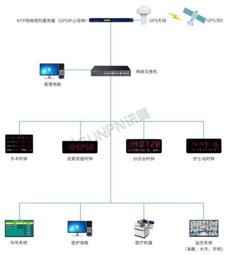 本方案以同步时钟系统为核心,深度融合北斗卫星授时与NTP协议,打造全院级精准时间网络: