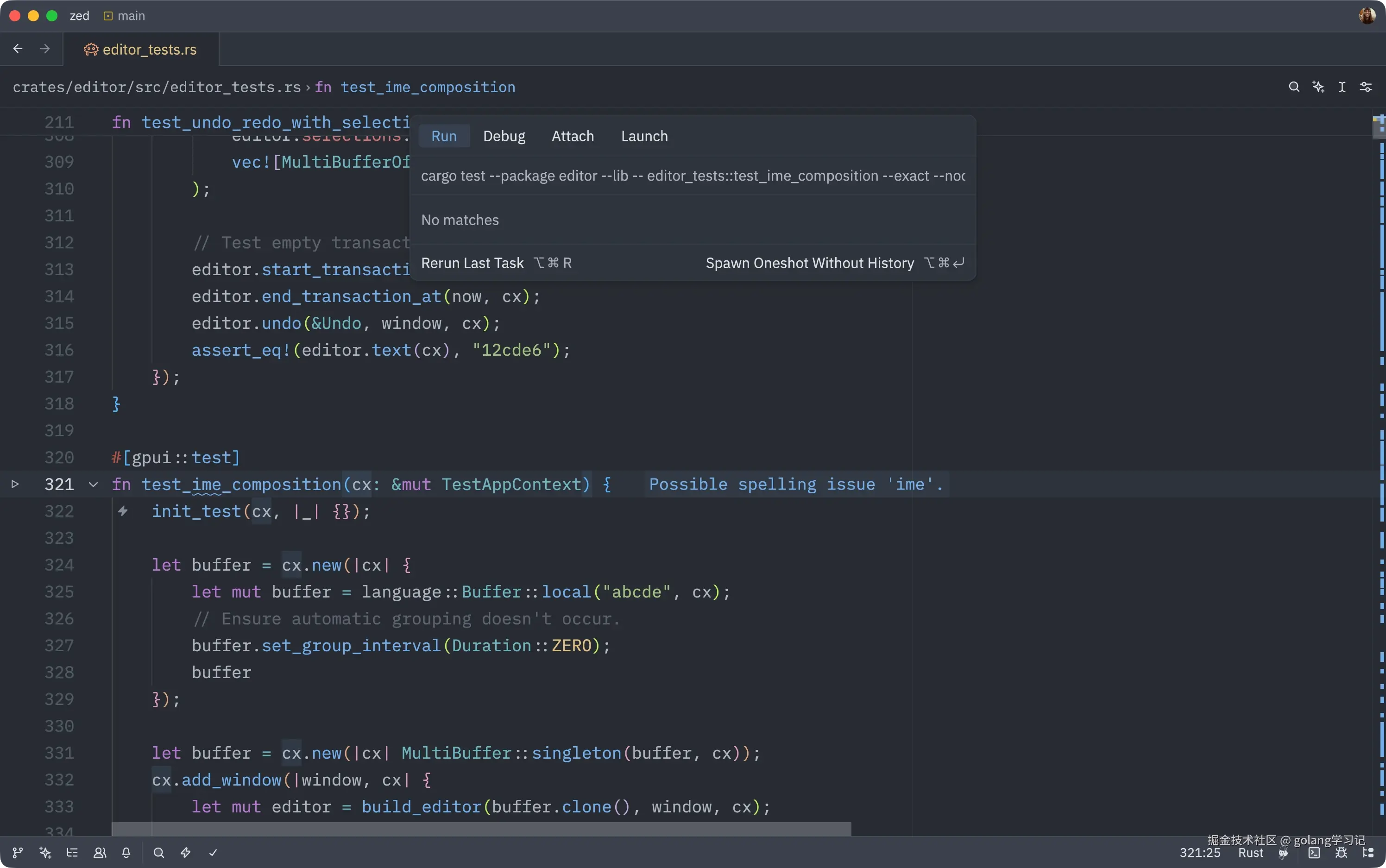 Zed 支持在代码行号旁显示 ▶️ 按钮,点击直接运行当前测试。