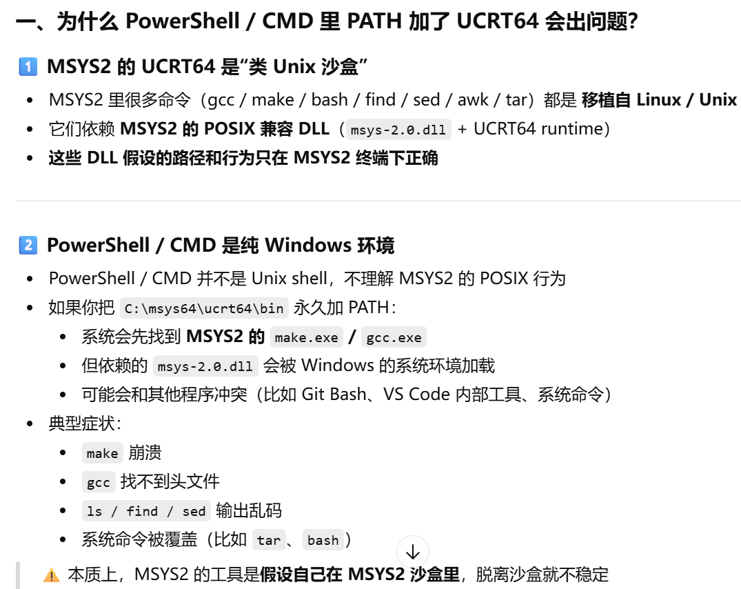 PowerShell / CMD 里调用的 gcc、make、其他系统命令可能行为异常?UCRT64在path里了,为什么会异常?