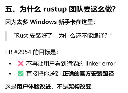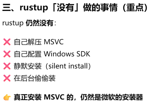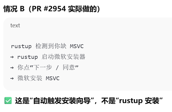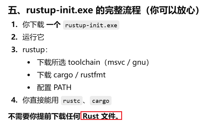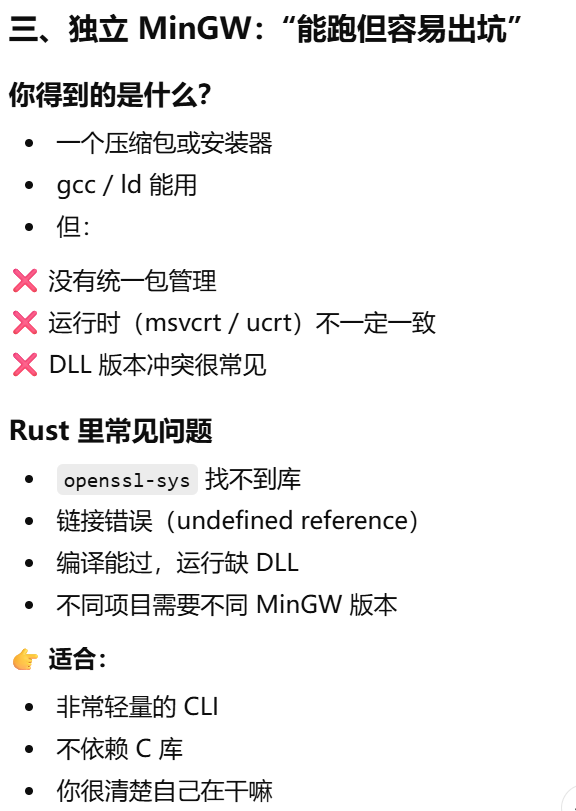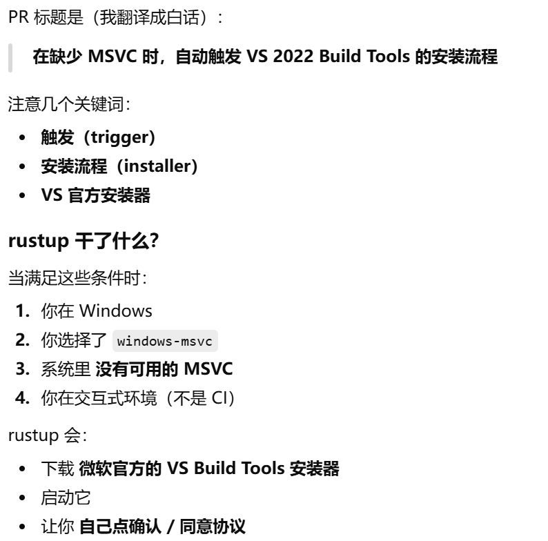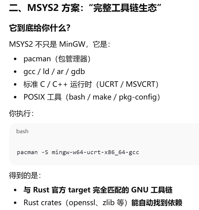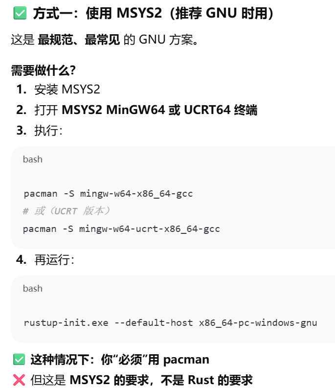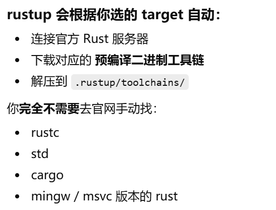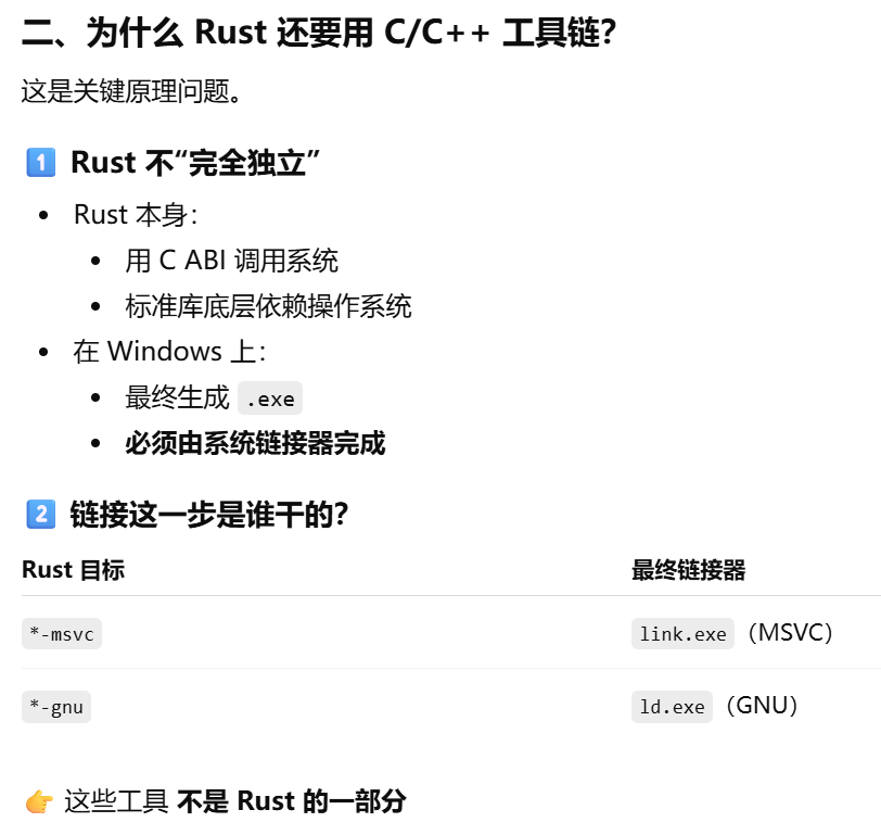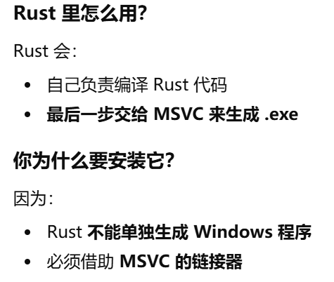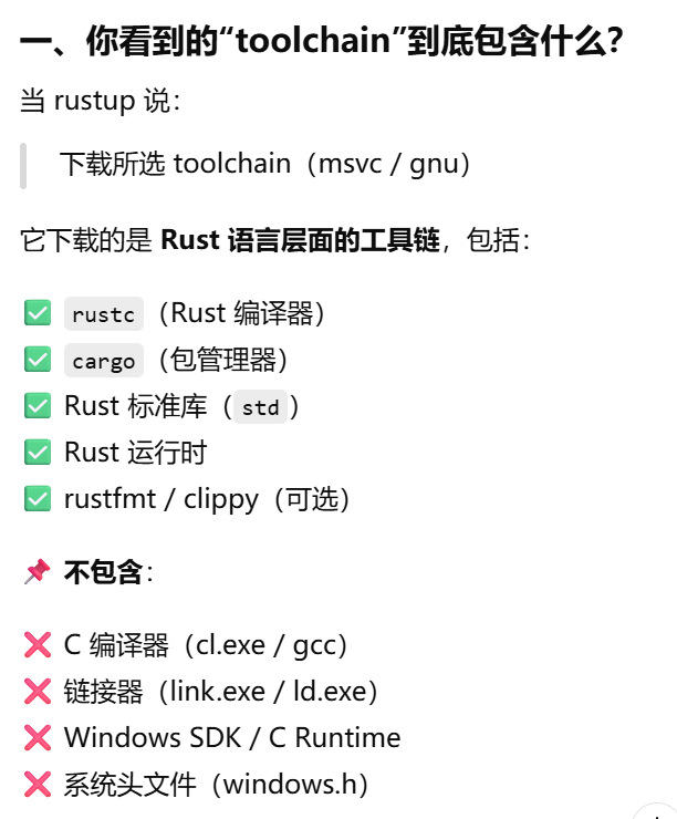 - [Rust 明明"帮下载了 toolchain",为什么仍然需要自己安装Visual Studio Build Tools(MSVC)或 MinGW / MSYS2(GNU)](#Rust 明明“帮下载了 toolchain”,为什么仍然需要自己安装Visual Studio Build Tools(MSVC)或 MinGW / MSYS2(GNU))