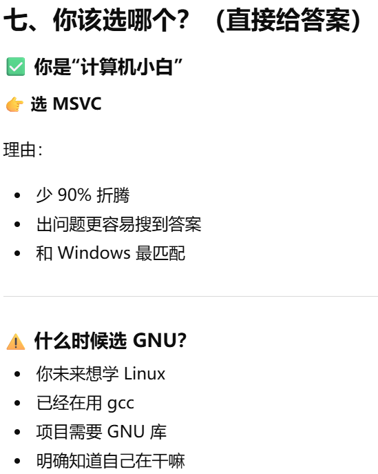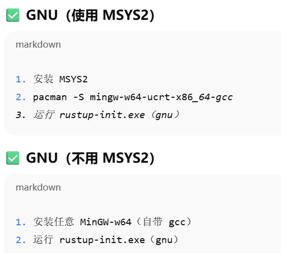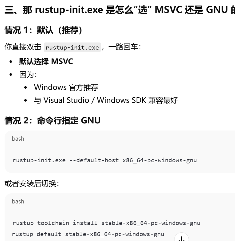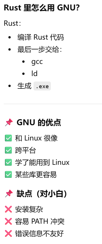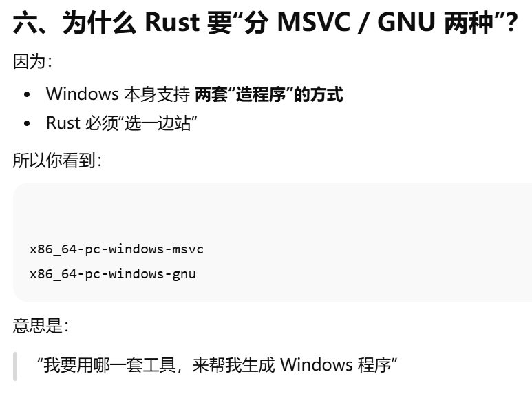 - [MSVC vs GNU,MSVC 和 GNU 都不是 Rust,也不是语言,它们是"把代码变成 Windows 程序"的两套工具](#MSVC vs GNU,MSVC 和 GNU 都不是 Rust,也不是语言,它们是“把代码变成 Windows 程序”的两套工具)