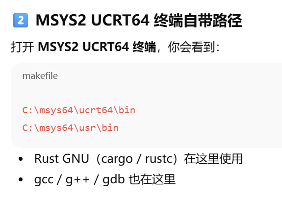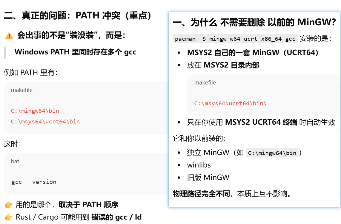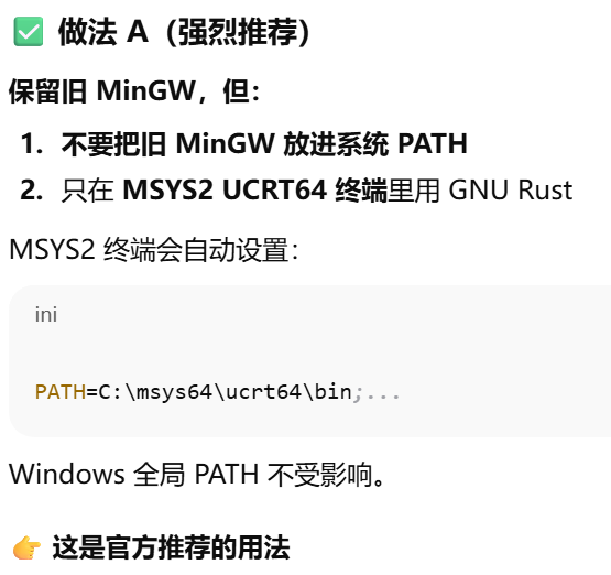 方案二:MinGW 留在 PATH,Rust 只在 MSYS2 里跑