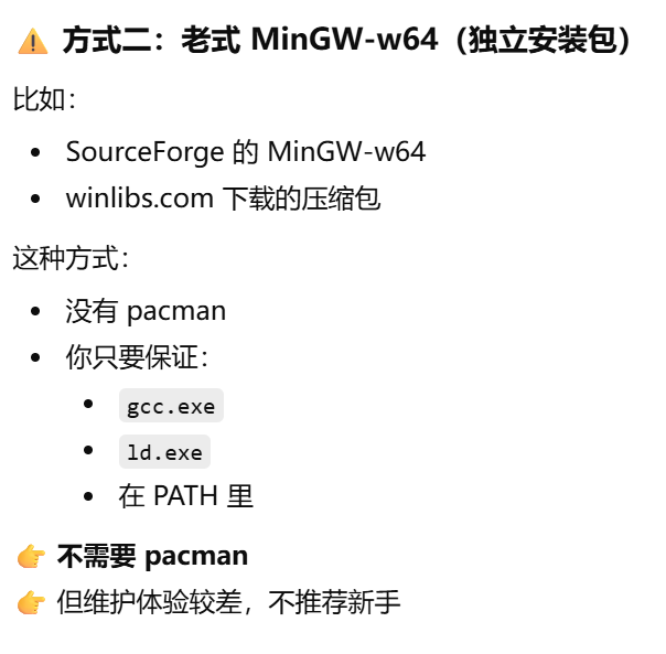 独立 MinGW = 能用、但老、不可控