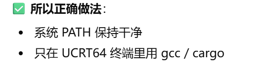 如果你只保留 MSYS2 UCRT64,PowerShell / CMD / Git Bash 里就不能直接使用其中的 GNU 工具(gcc / g++ / make / cargo 等)