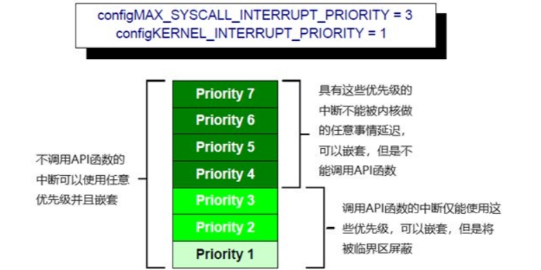 - 在内核或应用程序处于临界区时,使用优先级1~3(含)的中断将被阻止执行。在这些优先级下运行的ISR(中断服务程序)可以使用中断安全的FreeRTOS API函数。