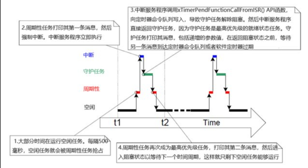 - 降低灵活性,不能单独设置每个推迟中断处理任务的优先级。每个推迟中断处理函数都以守护任务的优先级执行。注意守护任务的优先级由 FreeRTOSConfig.h 文件中的 configTIMER_TASK_PRIORITY 编译时配置常量设置。