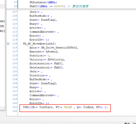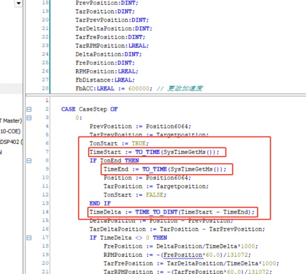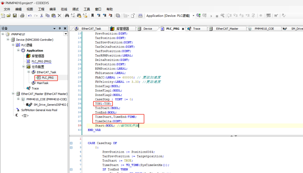 (10)然后回到PLC_PRG中,声明一个定时器TON1,两个TIME型变量TimeStart和TimeEnd,以及一个DINT型变量TimeDelta。