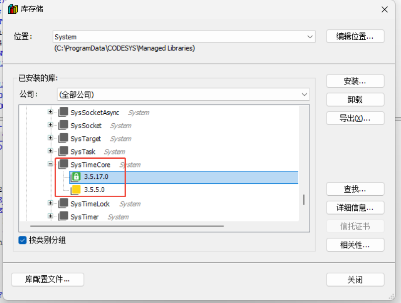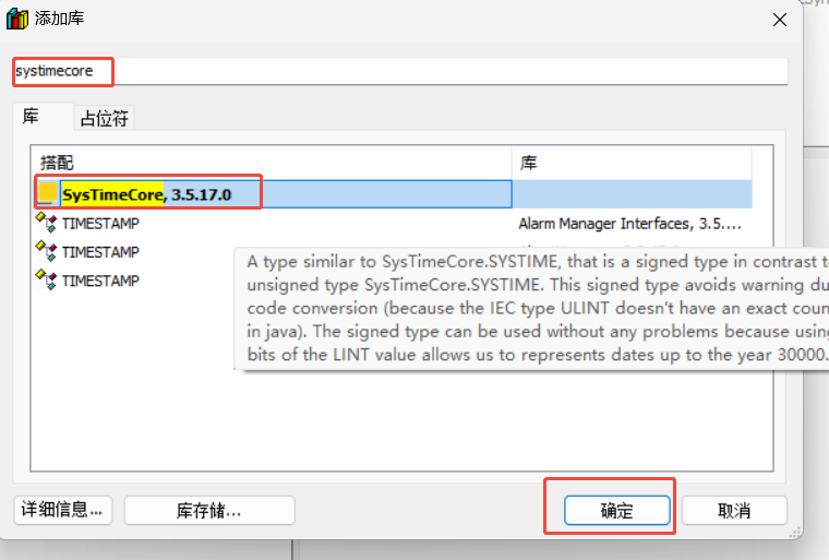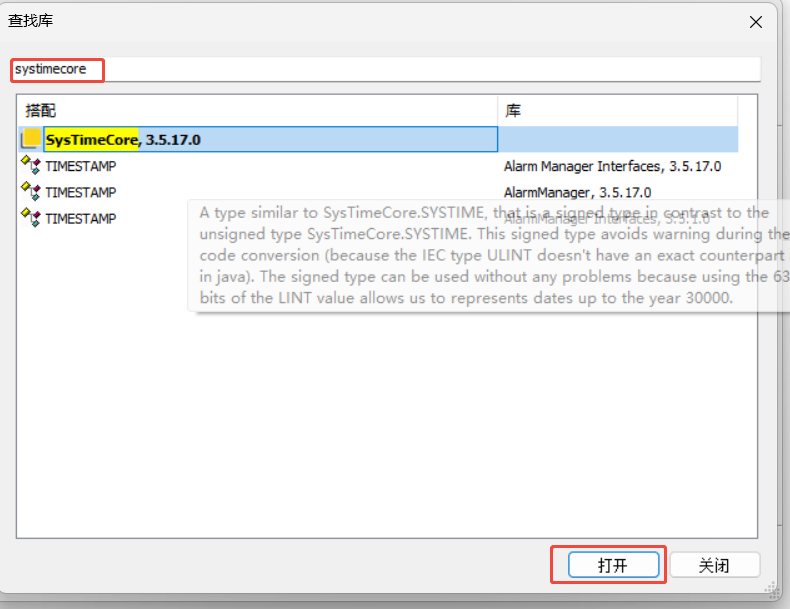 (3)在查找库弹窗中的顶部输入"systimecore",鼠标选中SysTimeCore,3.5.17.0,点击下面的打开。