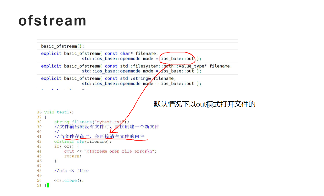 | explicit basic_ofstream( const char* filename, std::ios_base::openmode mode = std::ios_base::out ); | (2) | |