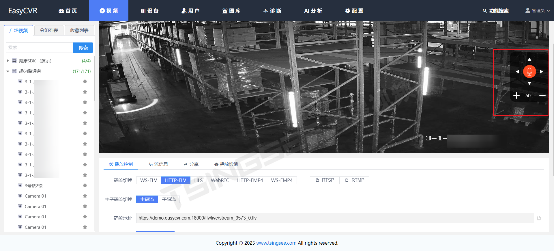 2、远程监控:平台支持7×24小时不间断远程实时监控,满足用户随时查看监控画面的需求。同时,支持RTMP、RTSP、HTTP-FLV、WebSocket-FLV、HLS、WebRTC、WS-FMP4、HTTP-FMP4等多种视频流播放,提供多种画面分屏及自定义轮播功能。