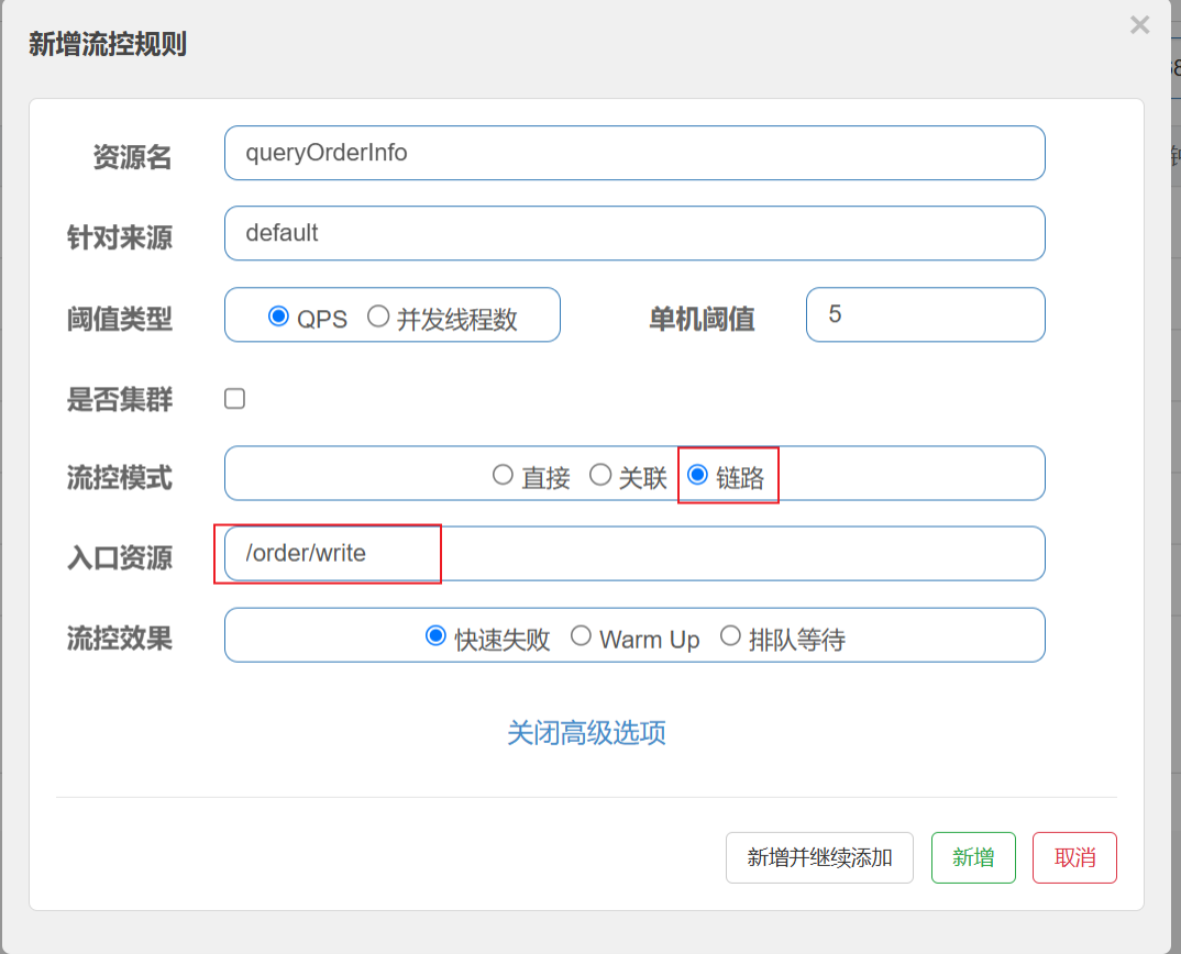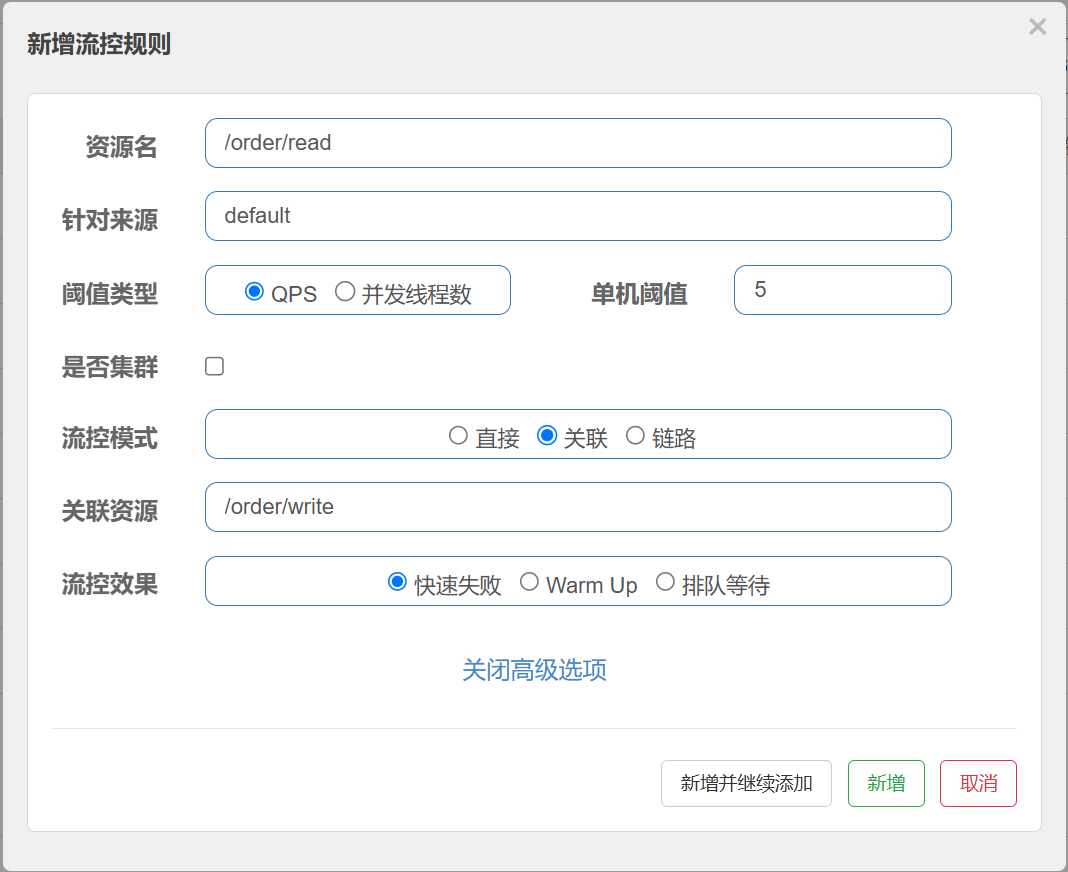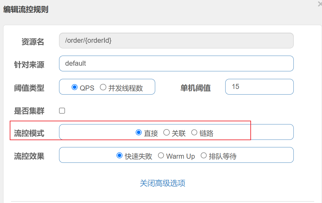 在添加限流规则时, 点击⾼级选项, 可以发现流控模式分为三种: 直接, 关联, 链路
