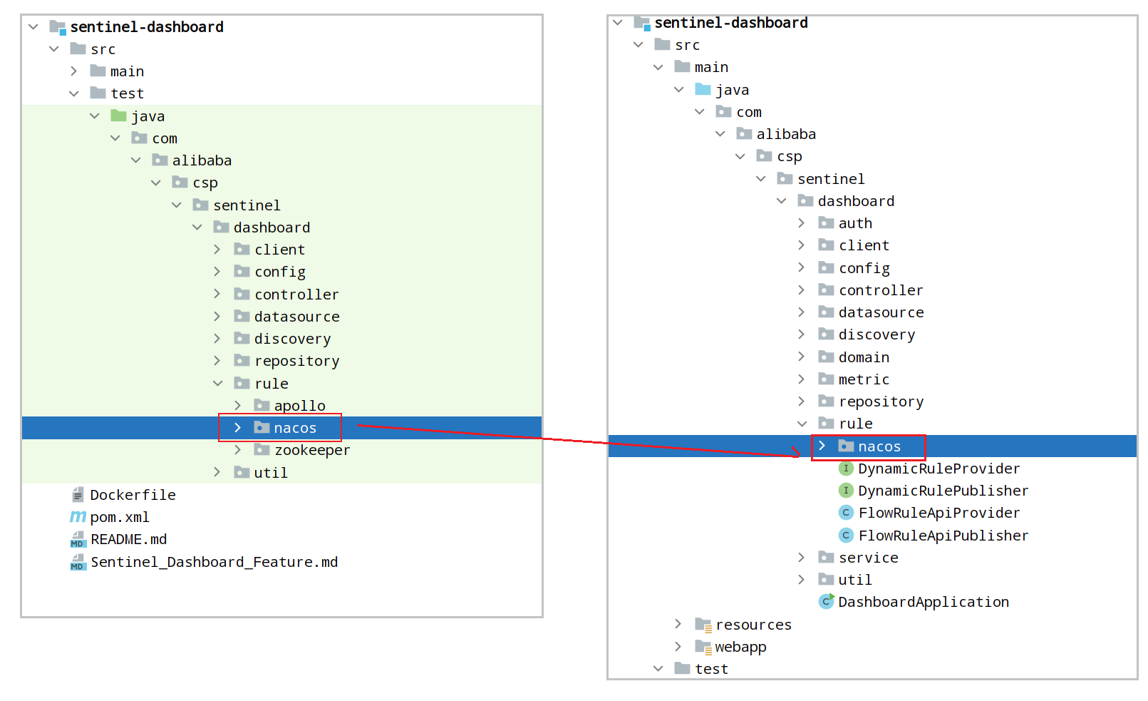 sentinel-dashboard 的 test 包下, 已经编写了对nacos的⽀持,接下来把com.alibaba.csp.sentinel.dashboard.rule.nacos ⽂件复制到src/main/java/com.alibaba.csp.sentinel.dashboard.rule ⽬录下