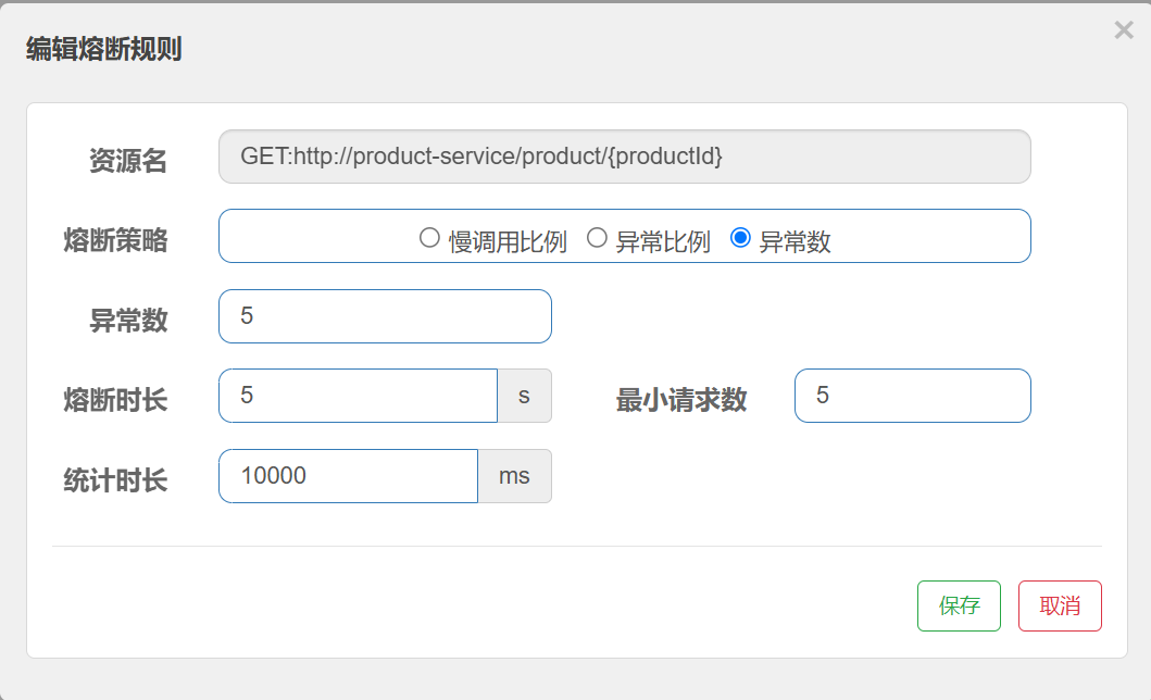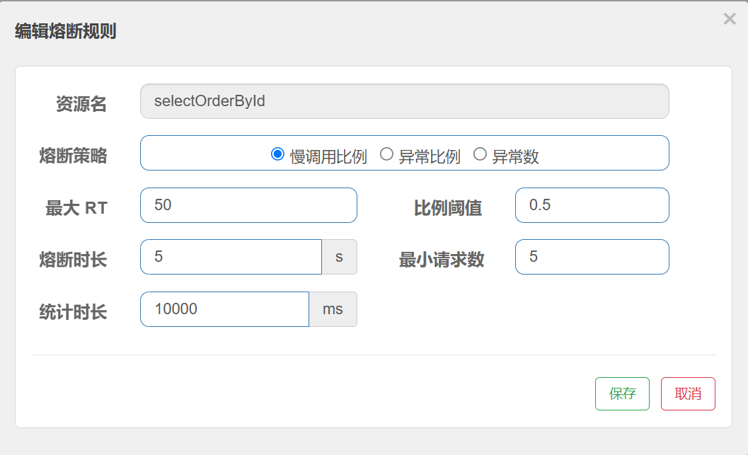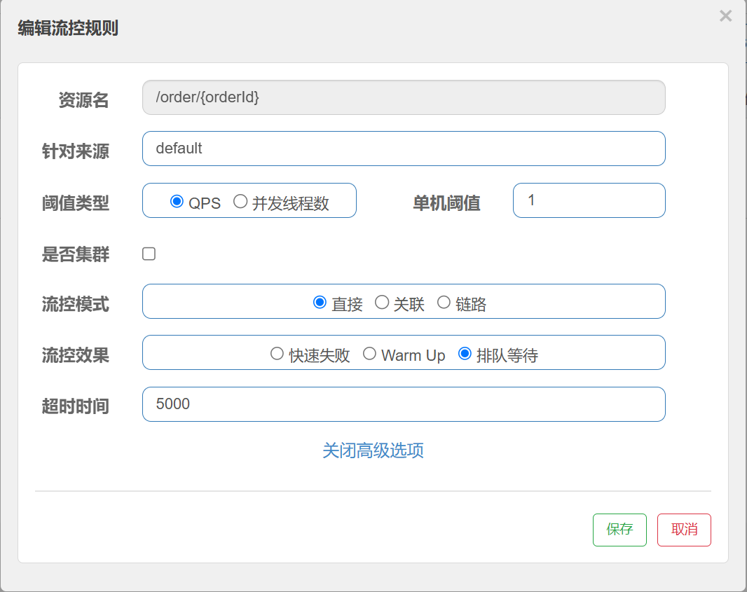 default : 表⽰不区分调⽤者, 来⾃任何调⽤者的请求都将进⾏限流统计. 如果这个资源名的调⽤总和超过了这条规则定义的阈值,则触发限流