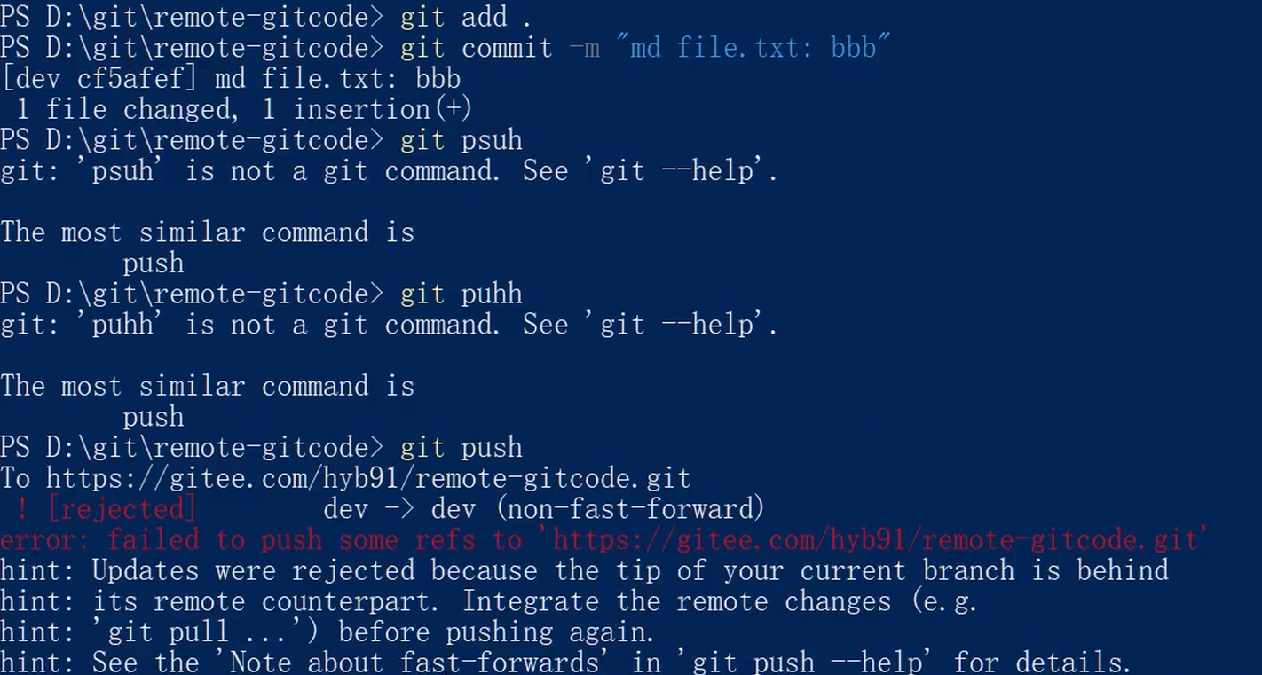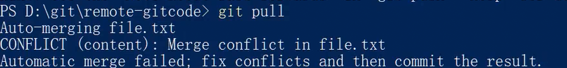 我们push失败了,在之前Git远程仓库同步代码时,我们就讲过,同一个文件,不同内容push时会冲突,这时候就需要我们修改文件: