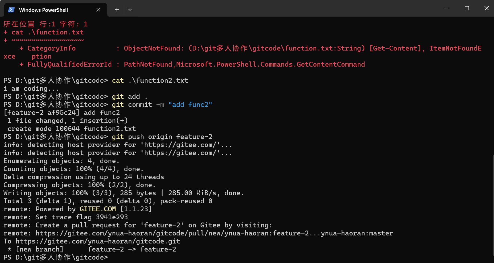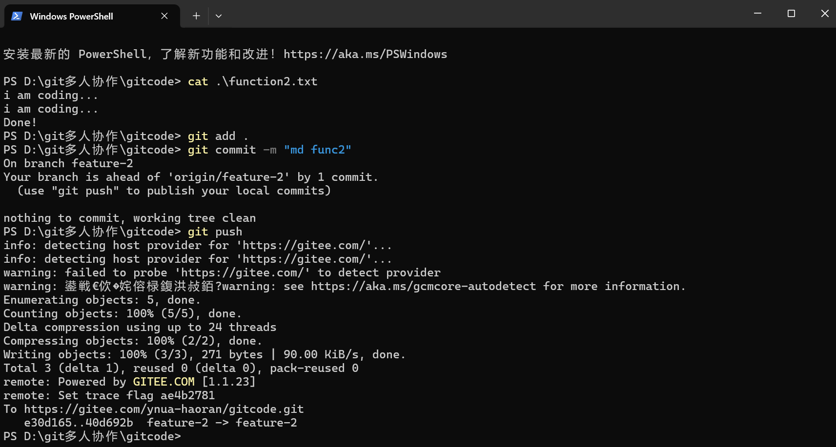 这时,你的小伙伴已经修养的差不多,可以继续进行自己的开发工作,那么他首先要获取到你帮他开发的内容,然后接着你的代码继续开发,我们将function2.txt文件新增 Done!作为开完完成的标志,进行推送: