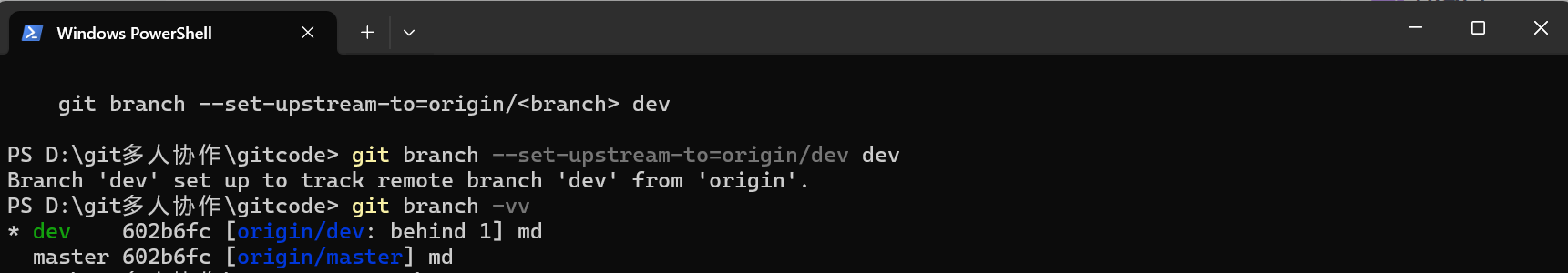 拉取后便可以看到远程的 dev 分支,接着切换到 dev 分支供我们进行本地开发。要说明的是,我们切换到的是本地的 dev 分支,根据示例中的操作,会将本地分支和远程分支进行关系链接