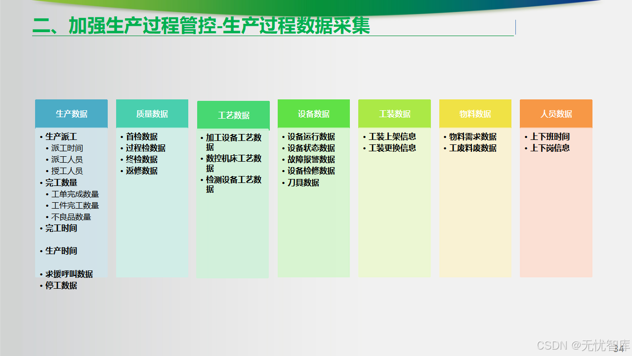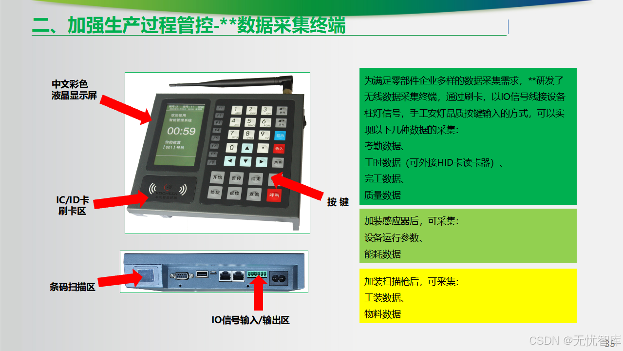 - 数据自动采集:利用无线数据采集终端、设备联网(IoT)等手段,自动采集设备运行状态(开/停/报警)、加工参数、完工数量、不良品数、工时等关键数据,取代手工报表。