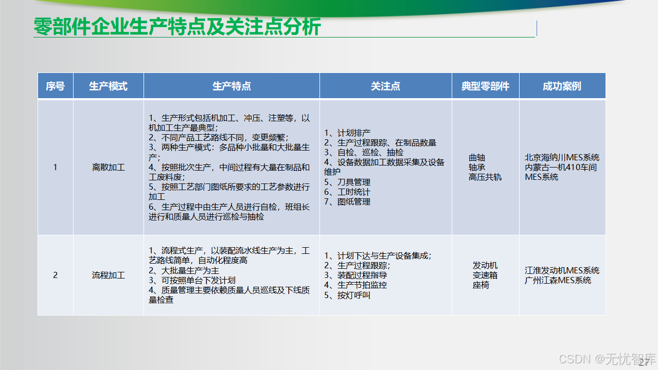 方案开篇即指出,汽车零部件种类繁多,生产工艺千差万别,但总体可分为两大类:离散加工 和流程加工。理解这两者的差异,是制定有效解决方案的前提。