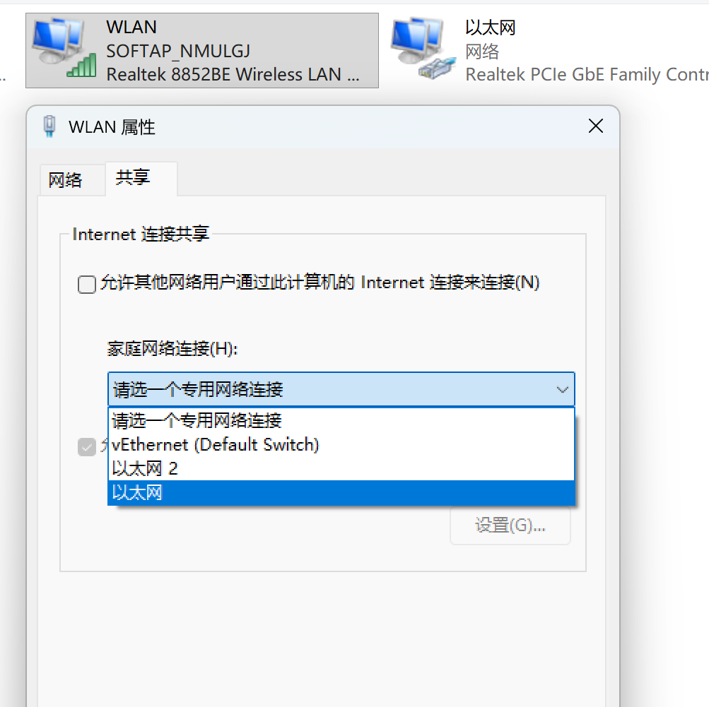 3、点击无线网的属性,切换到【共享】页,从【家庭网络连接(H)】列表中选择有线网卡,这里的名称是【以太网】。勾选【允许其他网络用户通过此计算机的Internet连接来连接(N)】,点击确定