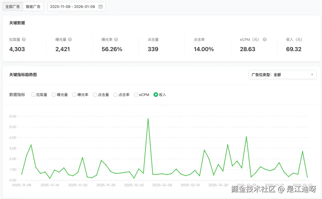 目前收益途径仅有流量主,功能全部是免费的。为了不影响用户的体验在流量主开通后,我只引入了开屏广告。目前流量主开通了3个月,一共收入69.32。平均每天是0.4左右,收益等于没有,哈哈。没有收益的软件如同无源之水,无根之木,是不长久的,也容易让用户产生我会随时跑路的担忧,我的计划是等我把福猪记账做得更完整更好的时候,再推出VIP功能。