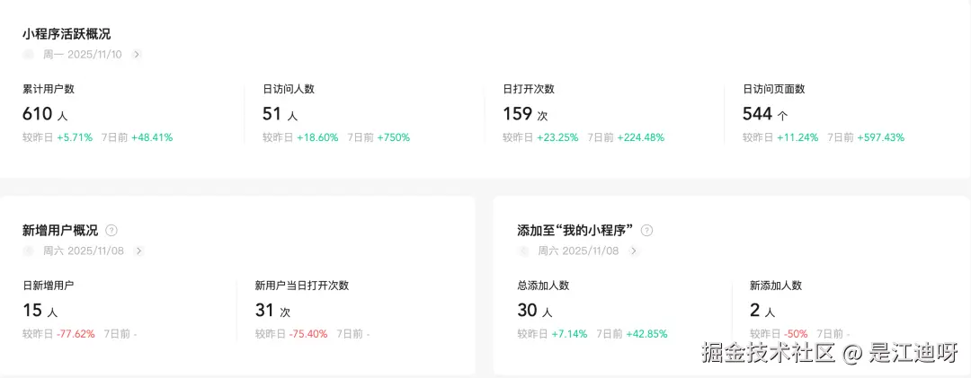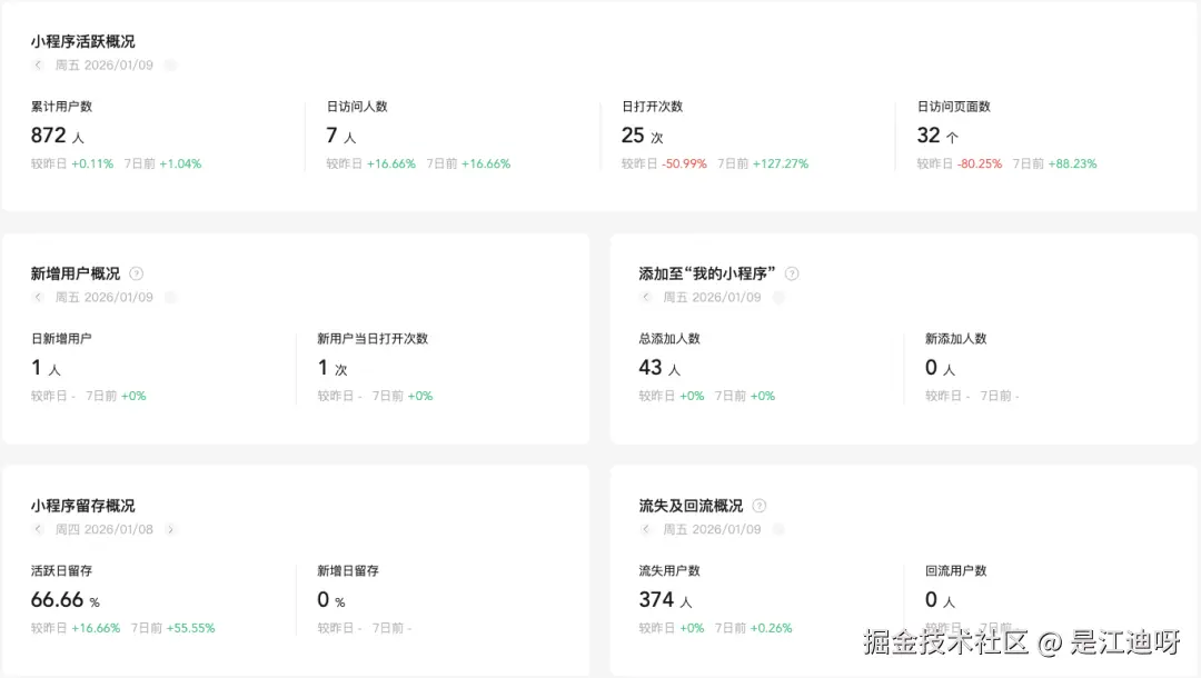 我在小程序上线后也没怎么宣传,只写了一篇公众号有1200多浏览量,然后全靠自然流量。虽然用户增长数据可观,但是留存数据不容乐观,从之前的日活:70多人到现在稳定在10几人。这也让我怀疑是不是我做的东西不好用,帮助不了用户,为了 防止闭门造车 我会积极听取身边朋友和用户的反馈和建议,作出调整优化, 让它越来越好 。 无论未来如何,这个项目我会一直更新迭代下去, 服务更多的用户,它是我的第一个完整的作品,同时也是我迈出独立开发的第一步!我一定会认真对待。