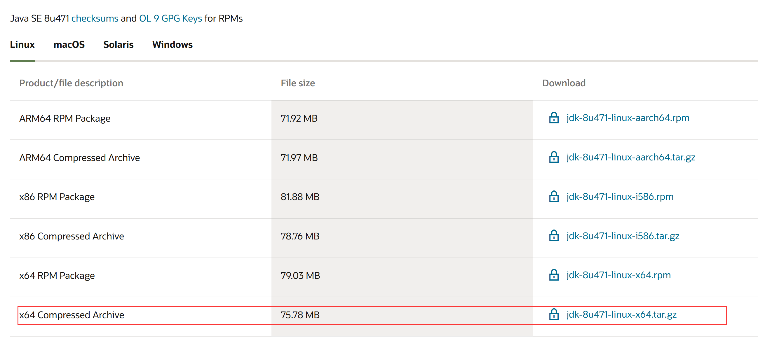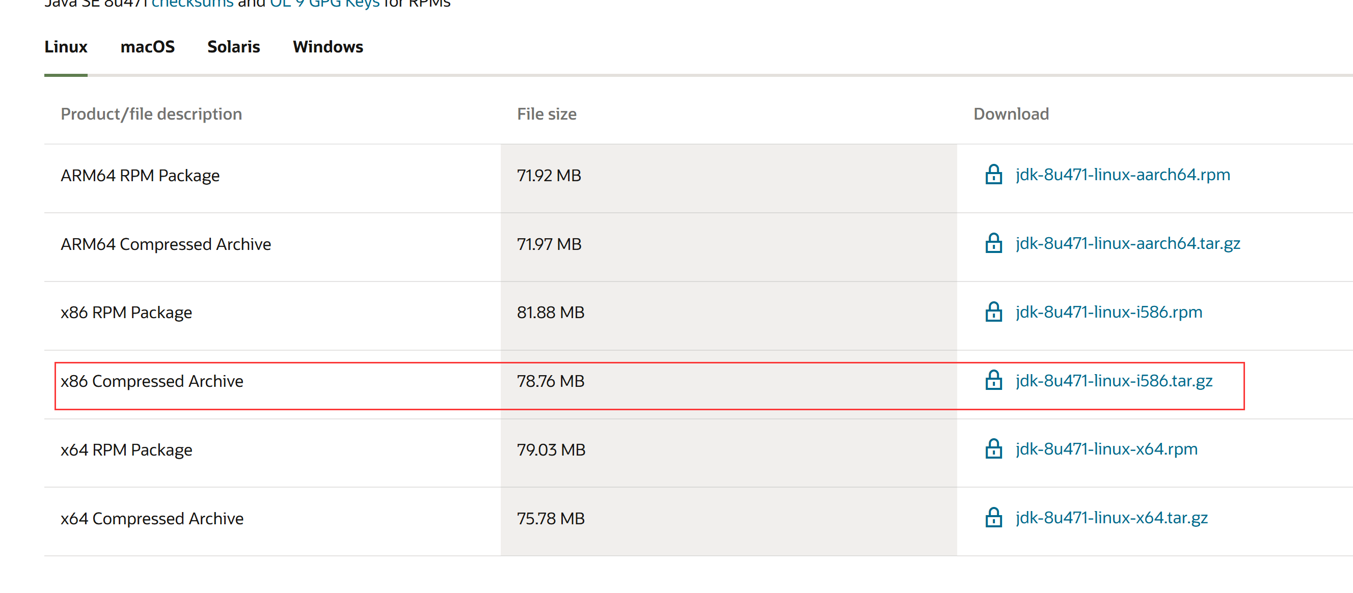 下滑找到jdk8,linux版本的,可以看到有很多版本,我们需要根据我们容器的内核版本来选择,看看是64位还是32位,使用