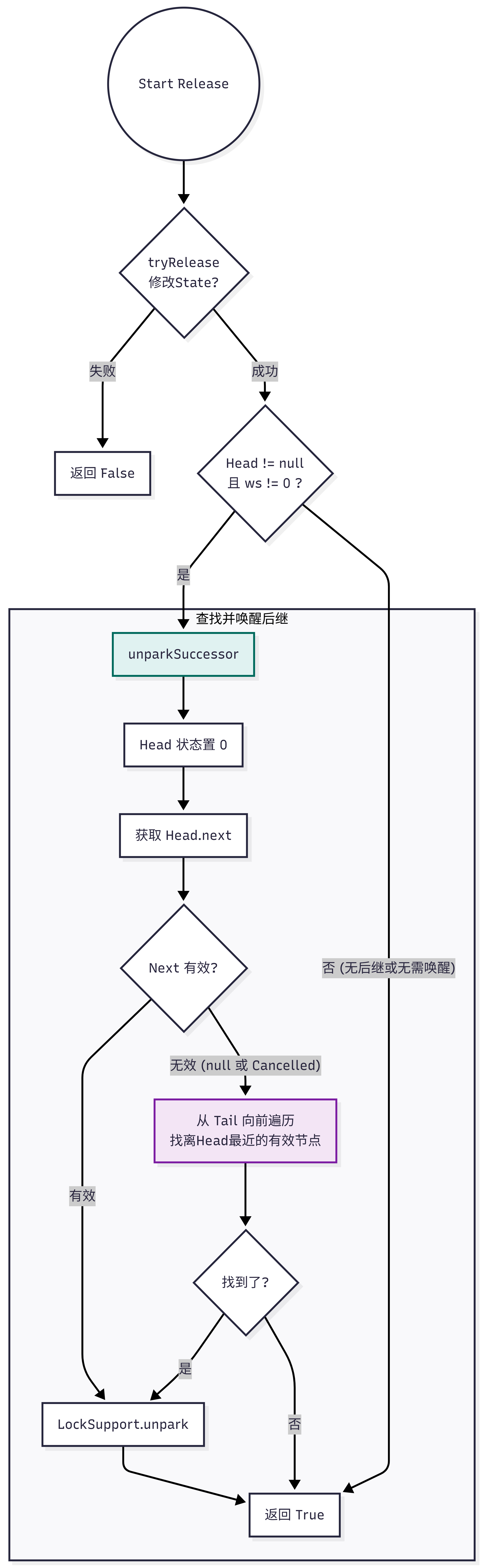 - 持有锁的线程释放锁 (release) -> 唤醒 Head 的后继节点 (Next) -> Next 醒来抢到锁 -> Next 执行。