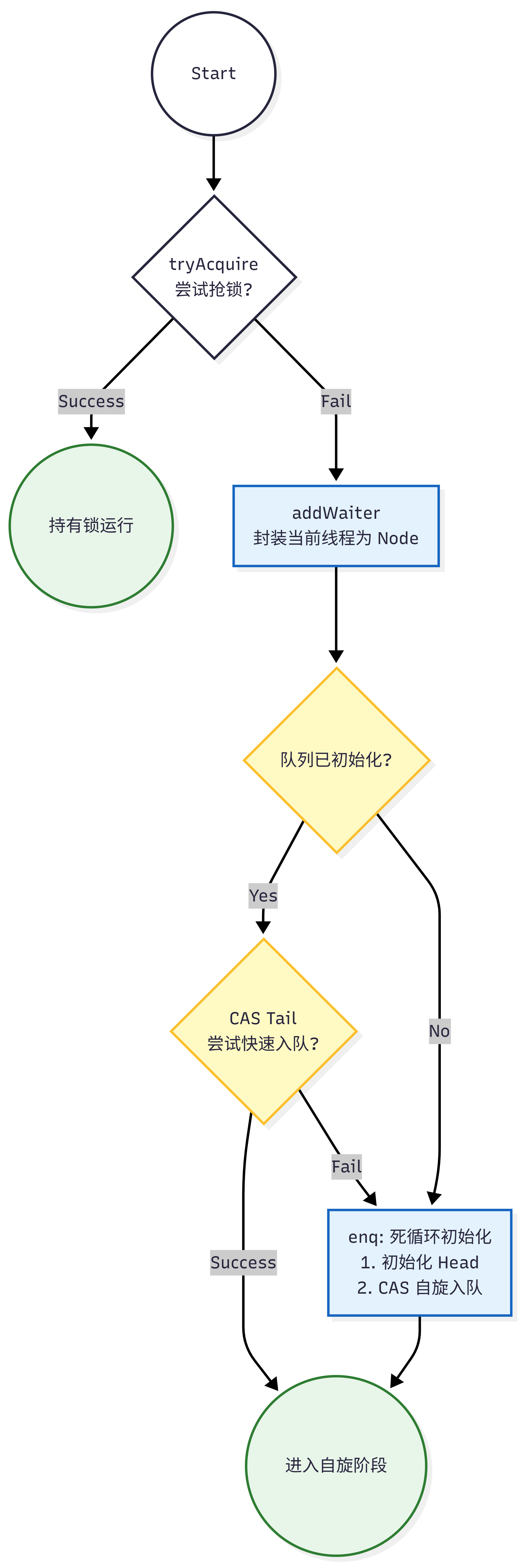 tryAcquire(arg):尝试直接获取资源。这是一个抽象方法,由子类实现(如ReentrantLock里的非公平锁实现直接 CASstate)。如果成功,直接返回。addWaiter(Node.EXCLUSIVE):如果获取失败,将当前线程封装成 Node,加入等待队列尾部。acquireQueued(node, arg):节点入队后,进入自旋+阻塞逻辑。selfInterrupt():如果在等待过程中被中断过,获取锁后补一个中断信号。