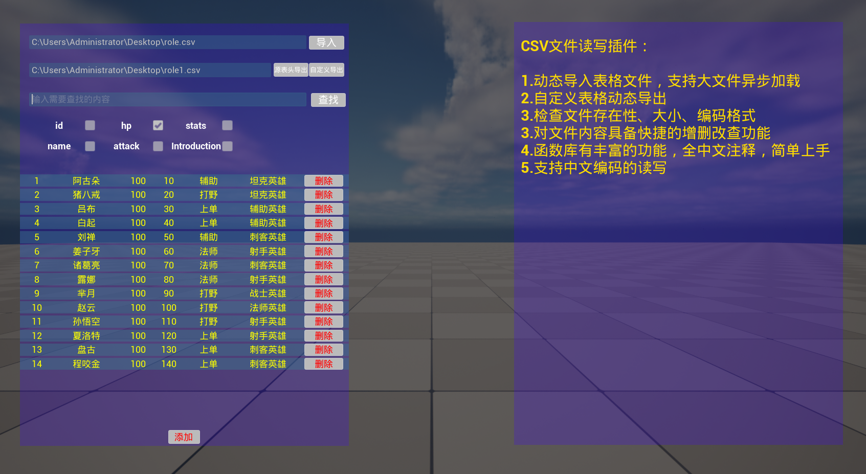 插件完全支持中文编码(UTF-8),所有核心功能均可通过蓝图和 C++ 调用,适用于策划配置表管理、数据导入导出、游戏存档系统等多种应用场景。