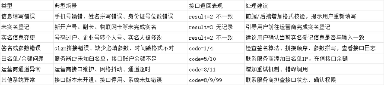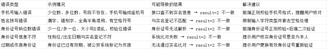运营商允许手机号变更实名主体,例如号码过户、从企业户转为个人户等。如果用户使用的是曾经过户过的号码,但输入的仍是旧实名信息,也会返回"不一致"。此类问题在用户感知上很容易被误以为接口出错,实际上是运营商数据库中的实名人已经更新。