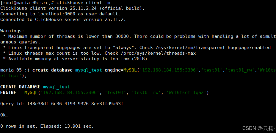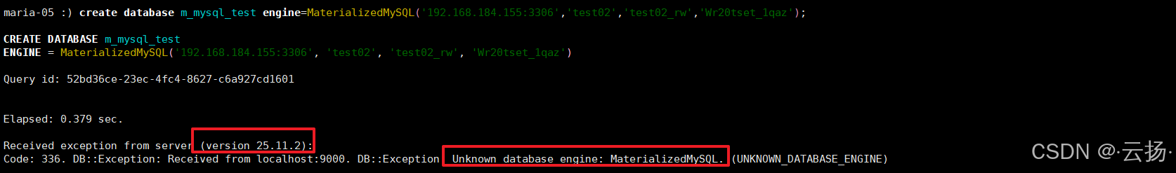 sql-- 开启实验性引擎(临时生效) set allow_experimental_database_materialized_mysql = 1; -- 创建MaterializedMySQL引擎库 create database m_mysql_test engine=MaterializedMySQL('192.168.184.155:3306','test02','test02_rw','IdcaTa6Q^d'); -
