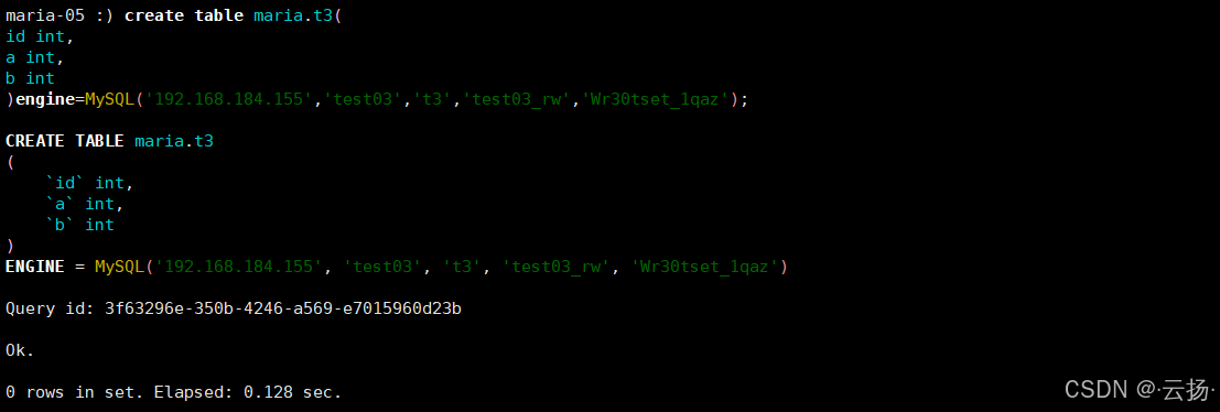 sqlcreate table maria.t3 ( id int, a int, b int ) ENGINE = MySQL('192.168.184.155:3306', 'test03', 't3', 'test03_rw', 'Ra8Gda6Q^d');
