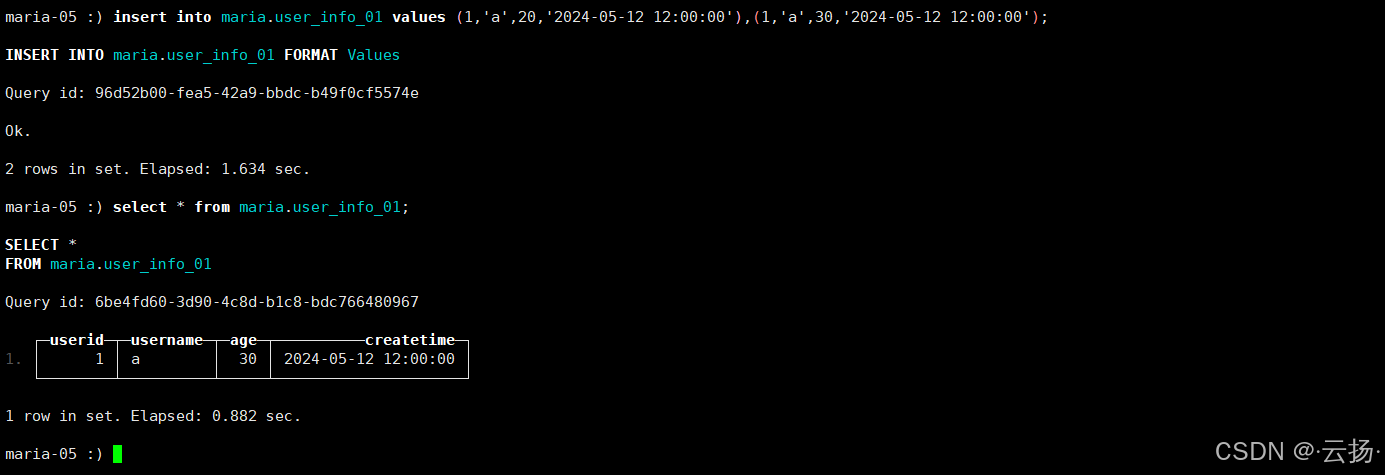sql-- 插入重复数据(userid=1, username=a出现两次) insert into maria.user_info_01 values (1,'a',20,'2024-05-12 12:00:00'), (1,'a',30,'2024-05-12 12:00:00'); -- 查询:重复数据被删除(保留最后一条) select * from maria.user_info_01;
