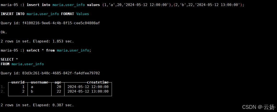 sql-- 插入测试数据 insert into maria.user_info values (1,'a',20,'2024-05-12 12:00:00'), (2,'b',22,'2024-05-12 13:00:00'); -- 查询数据 select * from maria.user_info;
