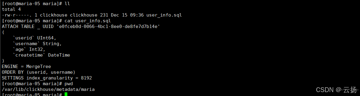 bashcd /var/bin/clickhouse/matedata/maria cat user_info.sql