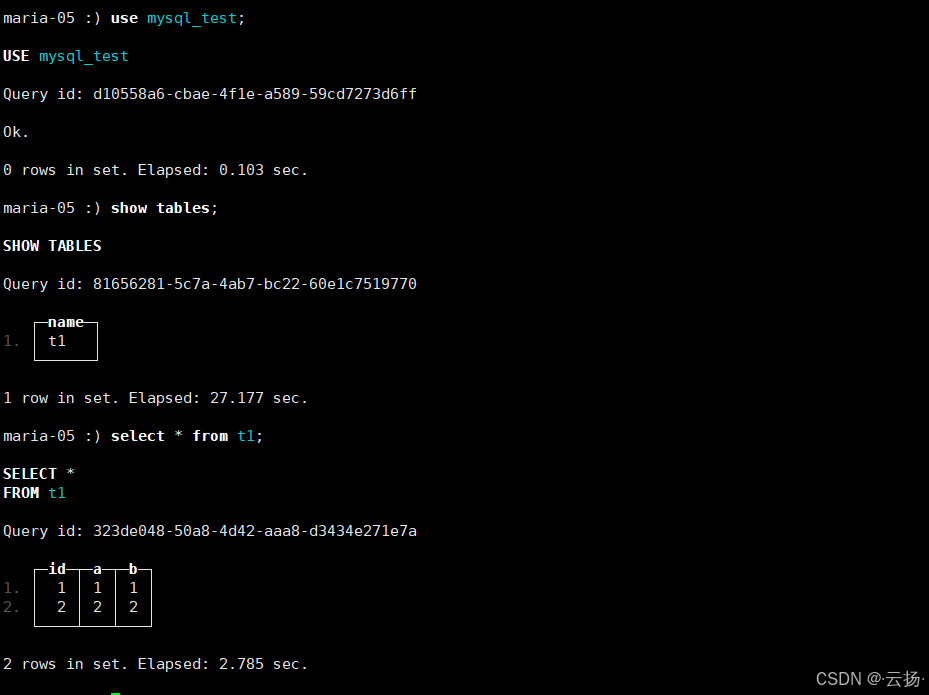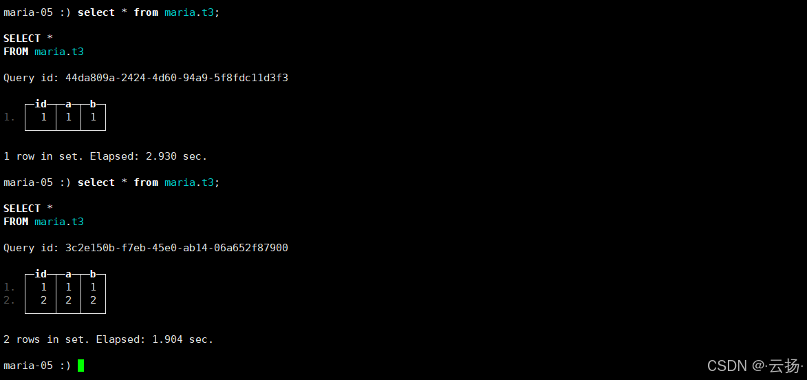 sql-- MySQL插入增量数据 insert into test03.t3(a,b) values (2,2); -- ClickHouse查询(实时同步MySQL数据) select * from maria.t3;