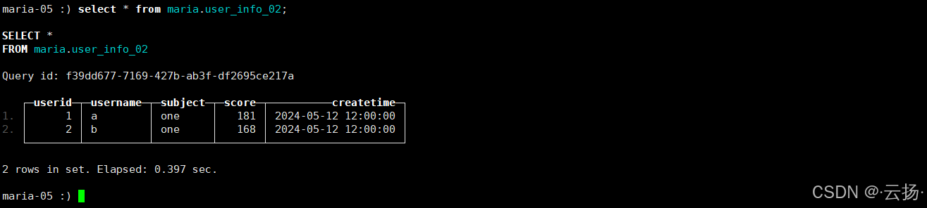 sql-- 插入用户分数数据 insert into maria.user_info_02 values (1,'a','one',91, '2024-05-12 12:00:00'), (1,'a','two',90, '2024-05-12 12:00:00'), (2,'b','one',88, '2024-05-12 12:00:00'), (2,'b','two',80, '2024-05-12 12:00:00'); -- 触发合并后查询:同一userid+username的score被求和 select * from maria.user_info_02;