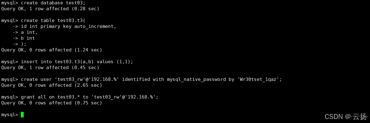 sqlcreate database test03; create table test03.t3( `id` int NOT NULL AUTO_INCREMENT, `a` int DEFAULT NULL, `b` int DEFAULT NULL, PRIMARY KEY (`id`) ) ENGINE=InnoDB; insert into test03.t3(a,b) values (1,1); -- 创建授权用户 create user 'test03_rw'@'192.168.%' identified with mysql_native_password by 'Ra8Gda6Q^d'; grant all on test03.* to 'test03_rw'@'192.168.%';